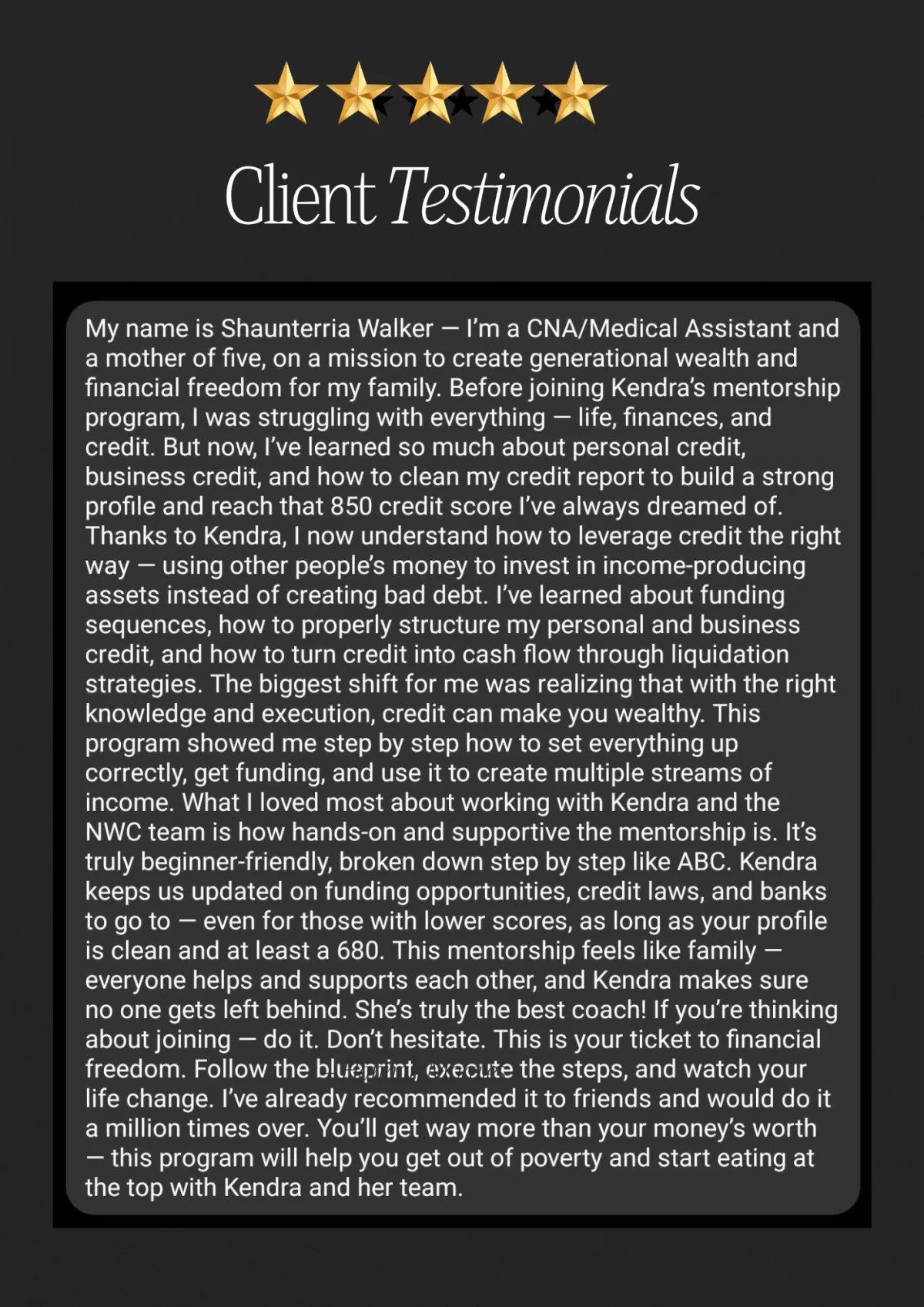 And if you’re ready to take back control of your life and finances by leveraging the power of credit to fund and build multiple 6-figure businesses, all you have to do is join the New Wealth Creation Academy today!