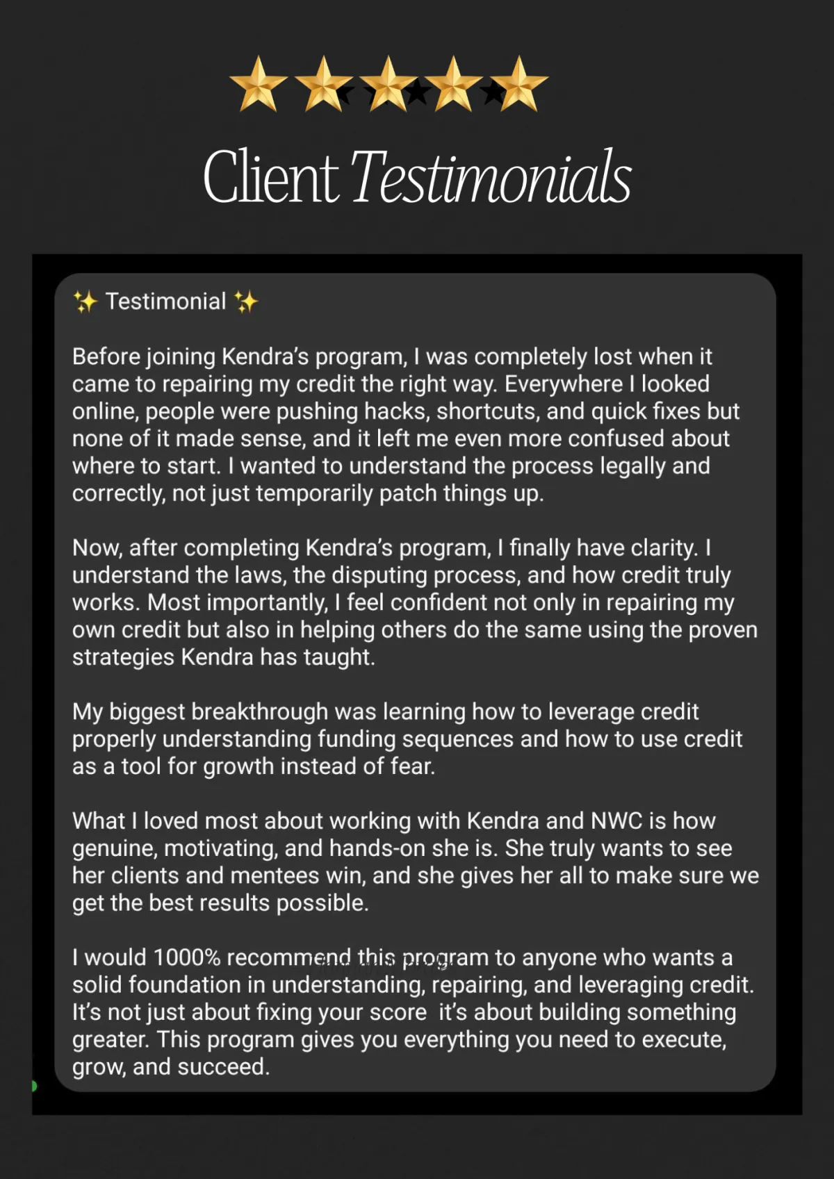 It’s time to take matters into your own hands. It’s not enough to repair your credit - it’s time to leverage its powers to build your own generational wealth and achieve true and lasting financial freedom.