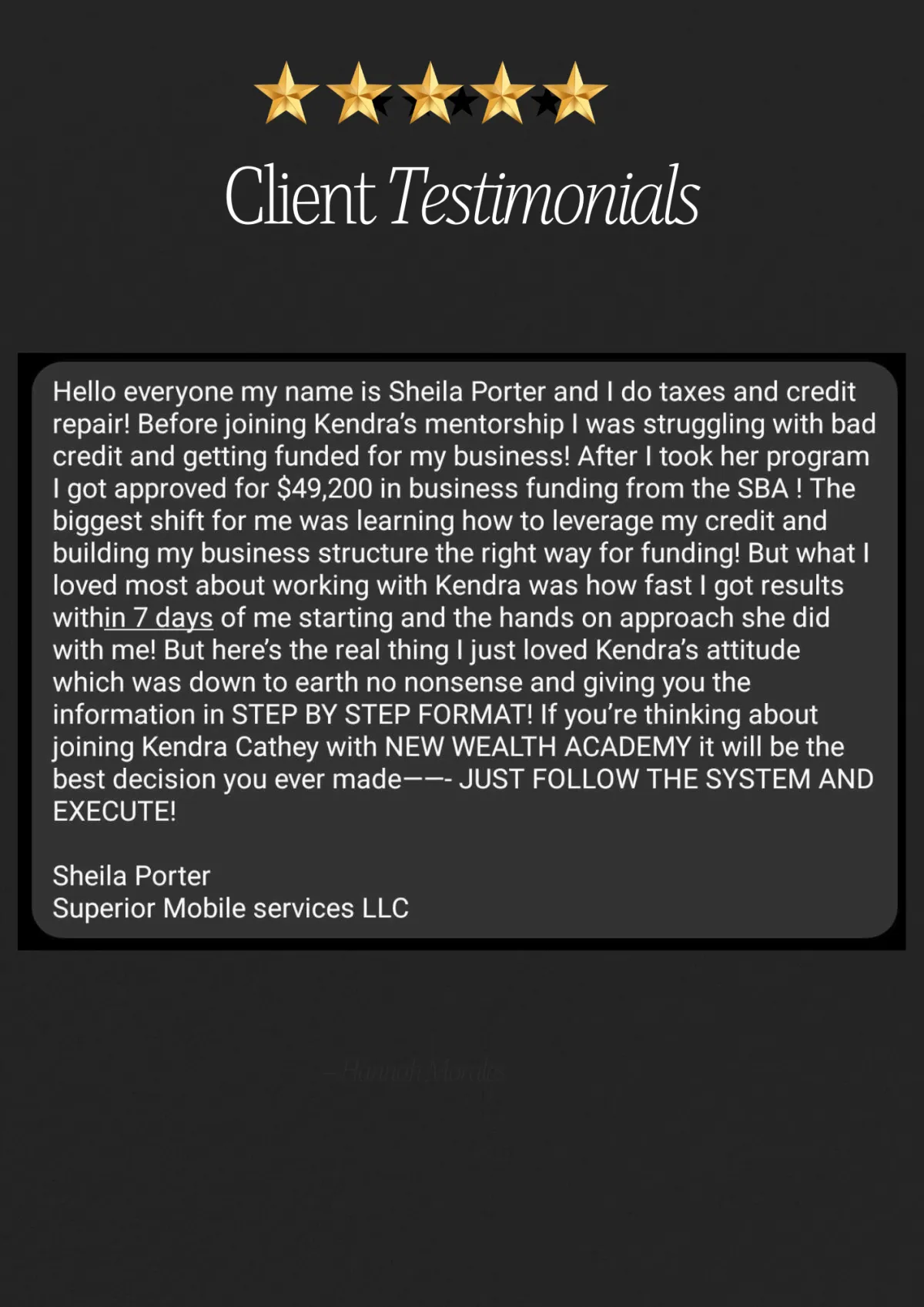 The lessons you’ll learn inside have helped me build multiple 6-figure businesses over the years. I’ve also taught hundreds of other students the same strategies and have helped them not build their own 6-figure businesses by using the power of credit. And if you follow these strategies, put in the work, and avoid making excuses, I’m sure it can work for you, too.